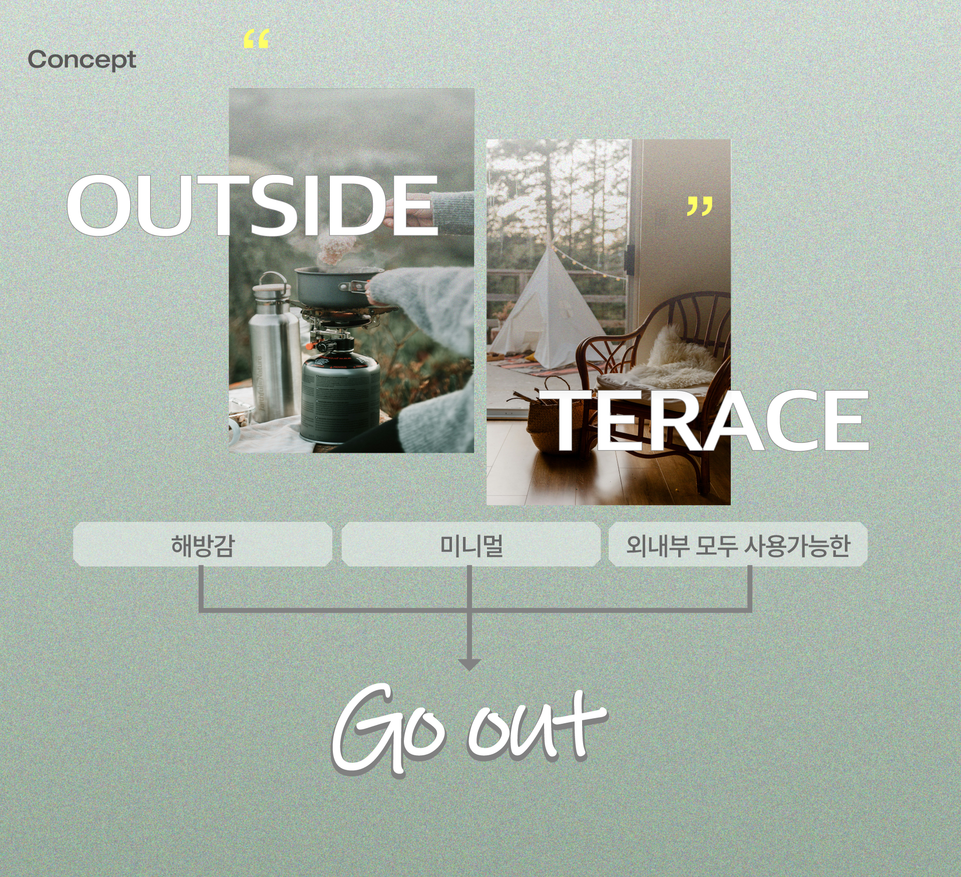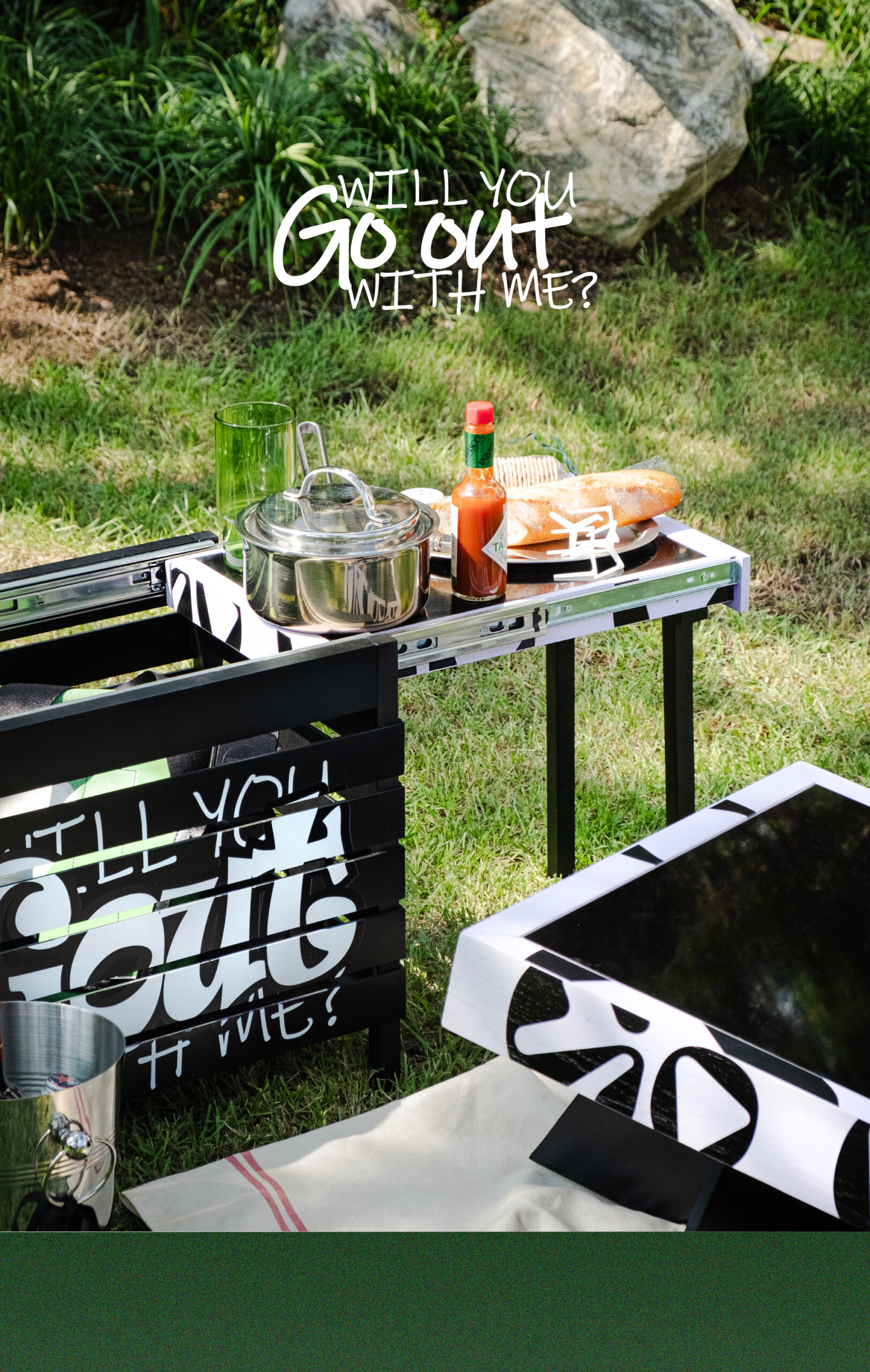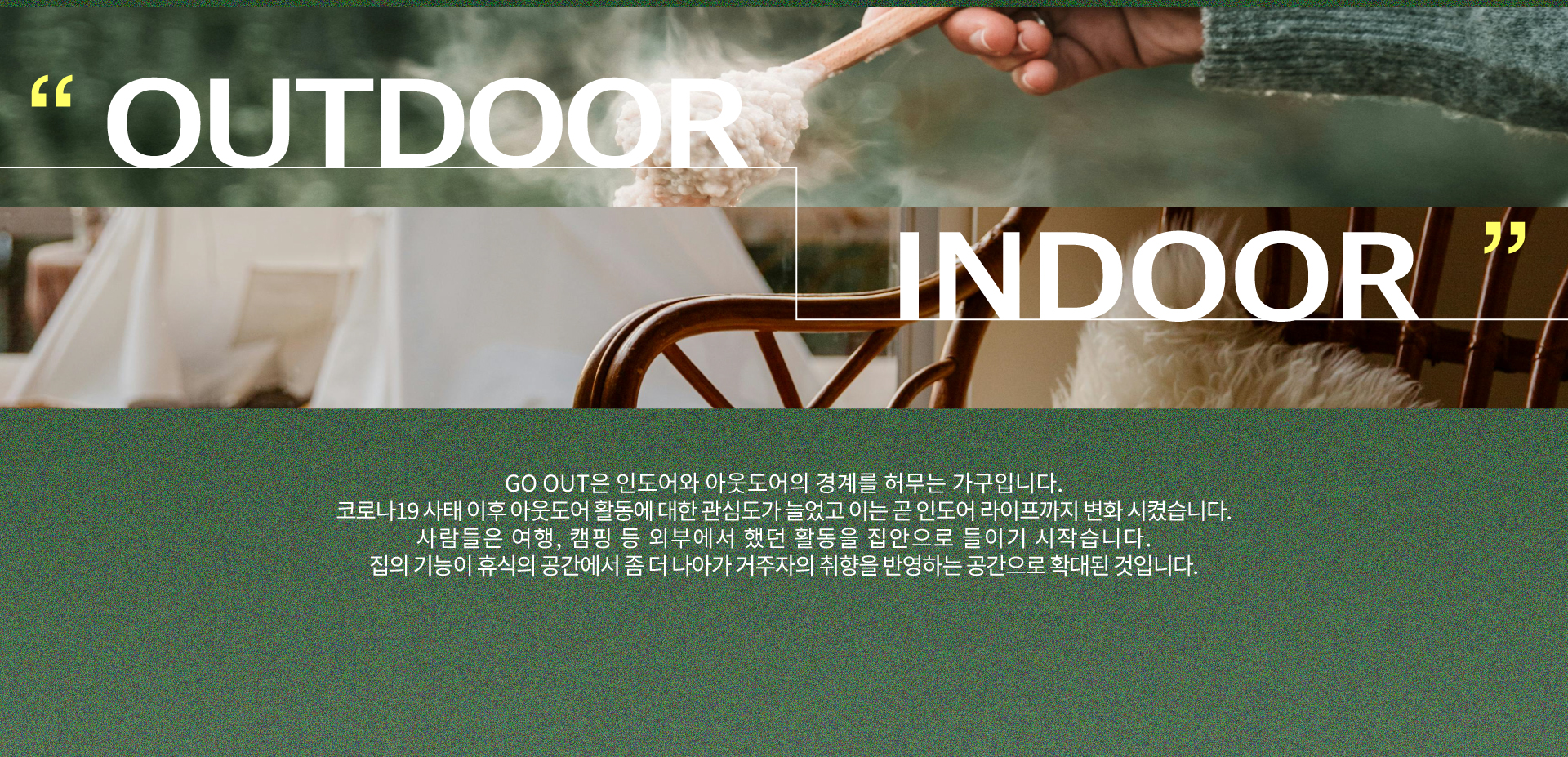GO OUT은 인도어와 아웃도어의 경계를 허무는 가구입니다. 집 안에서 사용하던 가구가 여행을 위한 장치가 되고, 외부에서 즐기던 취미를 내 방으로 들여오는 자유로운 일상을 경험해보세요.