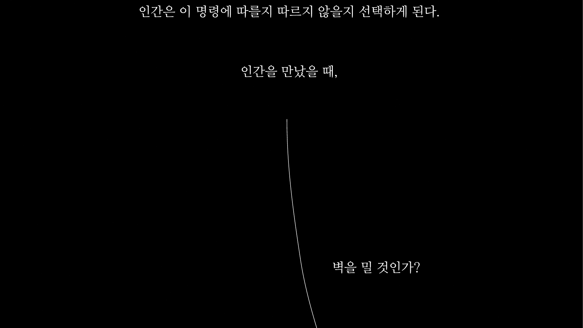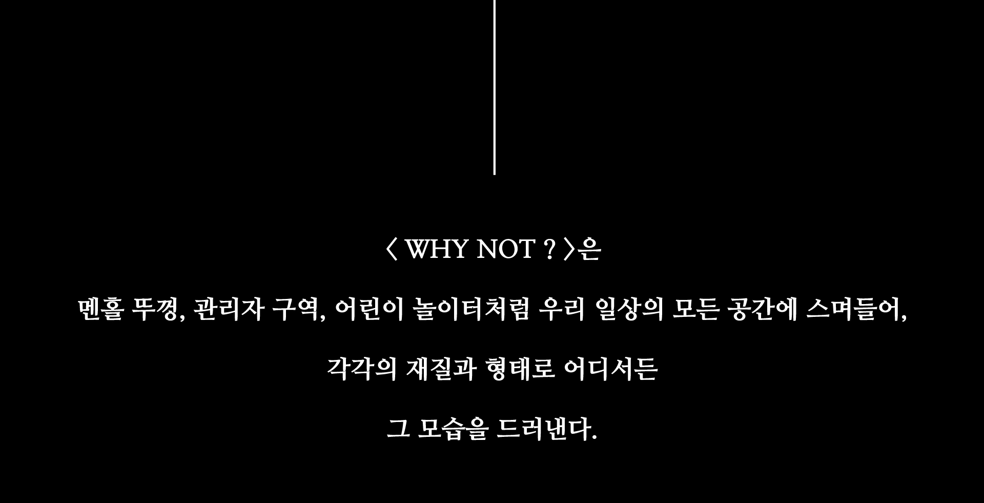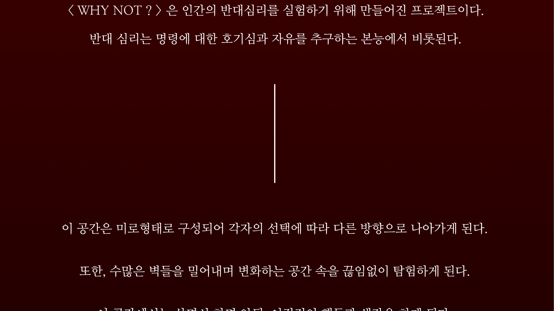 “WHY NOT ?”은 인간의 반대 심리를 실험하기 위해 설계되었다. 이 공간에서는 [ 벽을 밀다가 사람을 마주치면 그 자리에서 누워 자야 하고, 잠든 사람을 보면 깨워야 한다. ]는 명령을 반드시 따라야 한다. 감시는 없으며, 인간들은 매 순간 선택을 한다. 그 선택은 수백, 수만 가지 결과로 이어지며, 결국 각자의 본능과 마주하게 된다.