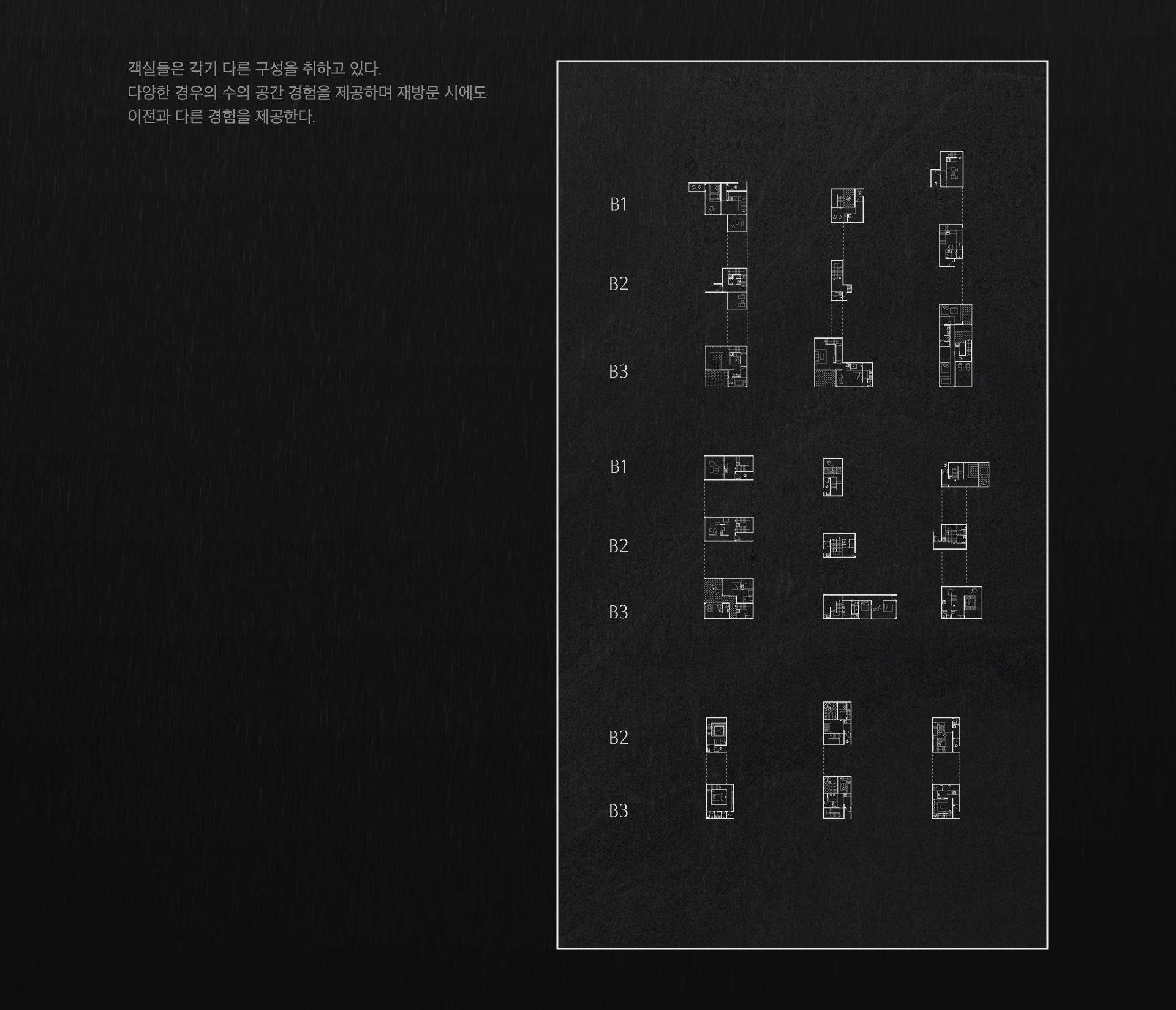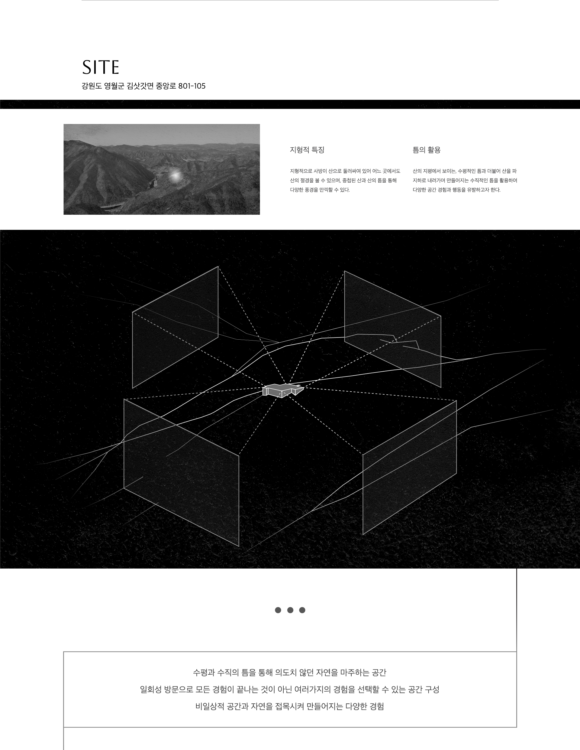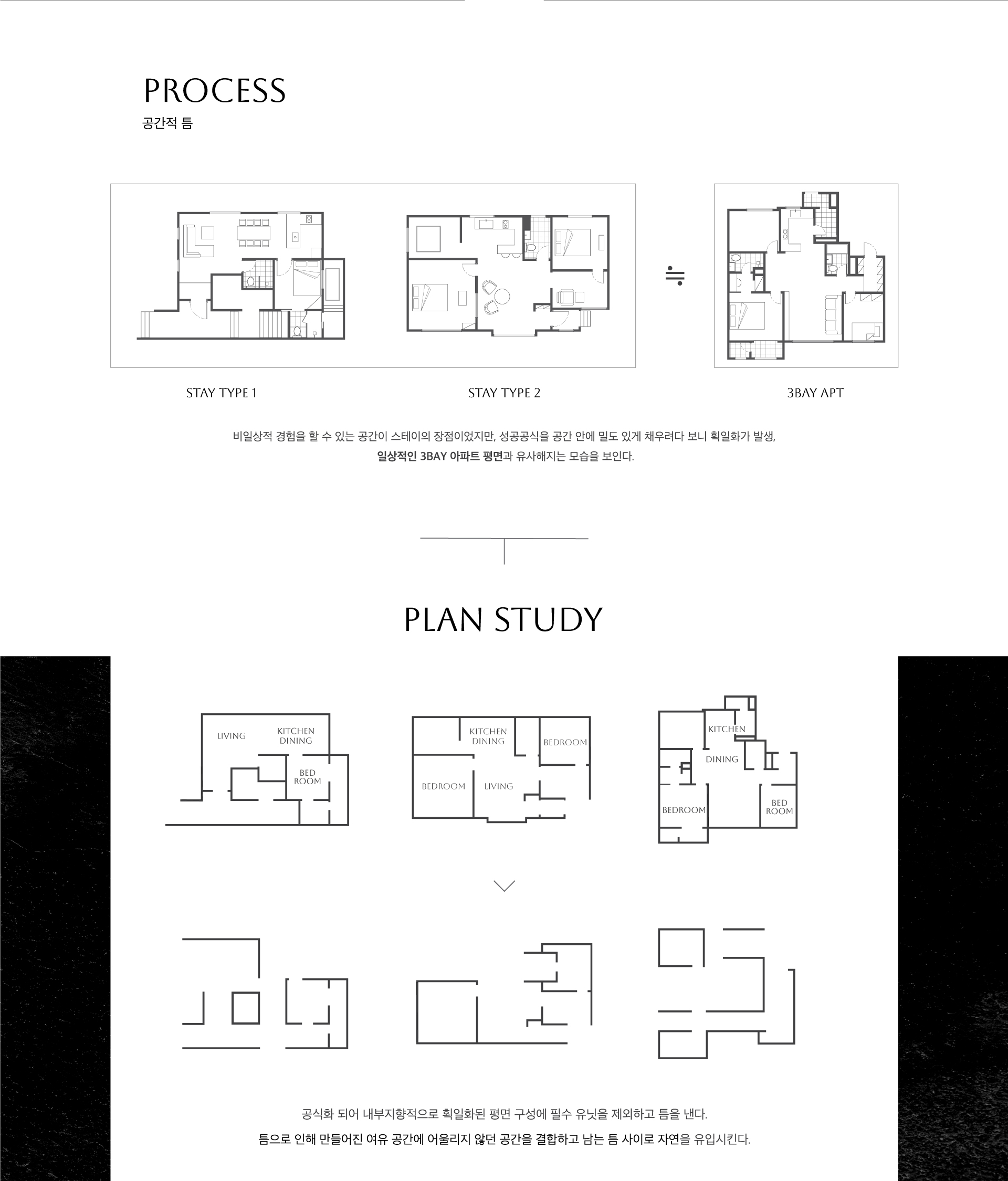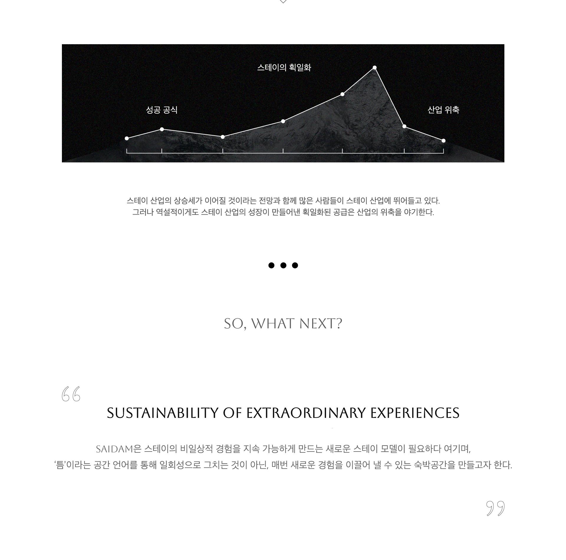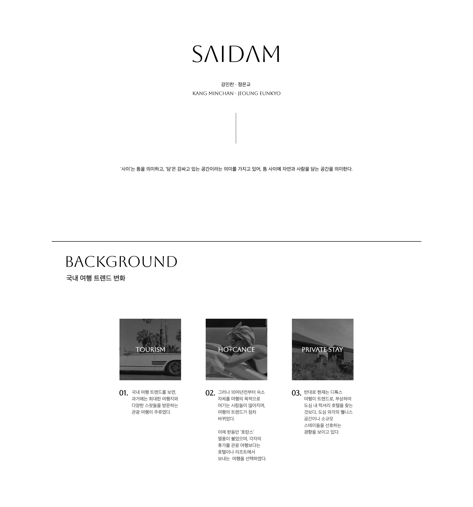 ‘사이’는 틈을 의미하고, ‘담은 감싸고 있는 공간이라는 의미를 가지고 있어, 틈 사이에 자연과 삶을 담는 공간을 의미한다. 사이담은 ‘틈’이라는 공간 언어로 풀어낸 스테이 공간이며, 정형화 되고 있는 스테이들 사이에서 사이담은 ‘틈’을 통한 비일상적 숙박 경험을 제공한다.