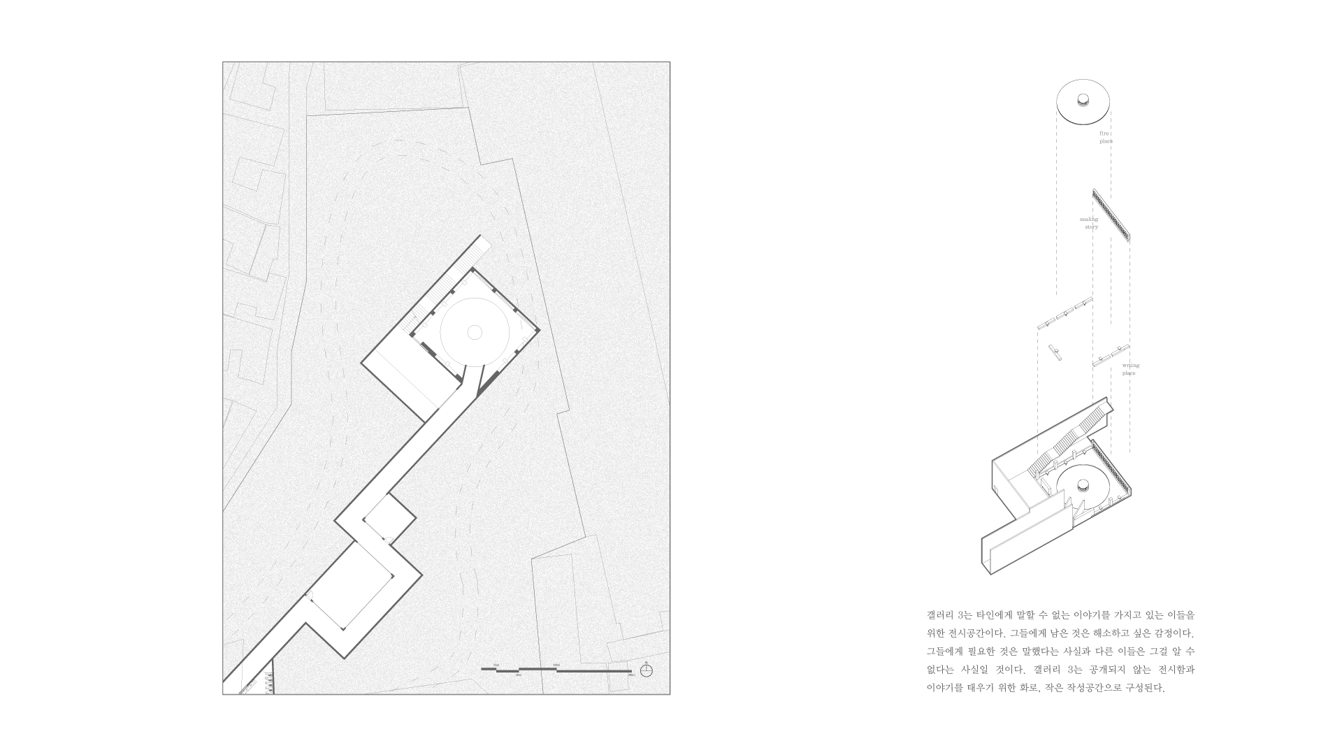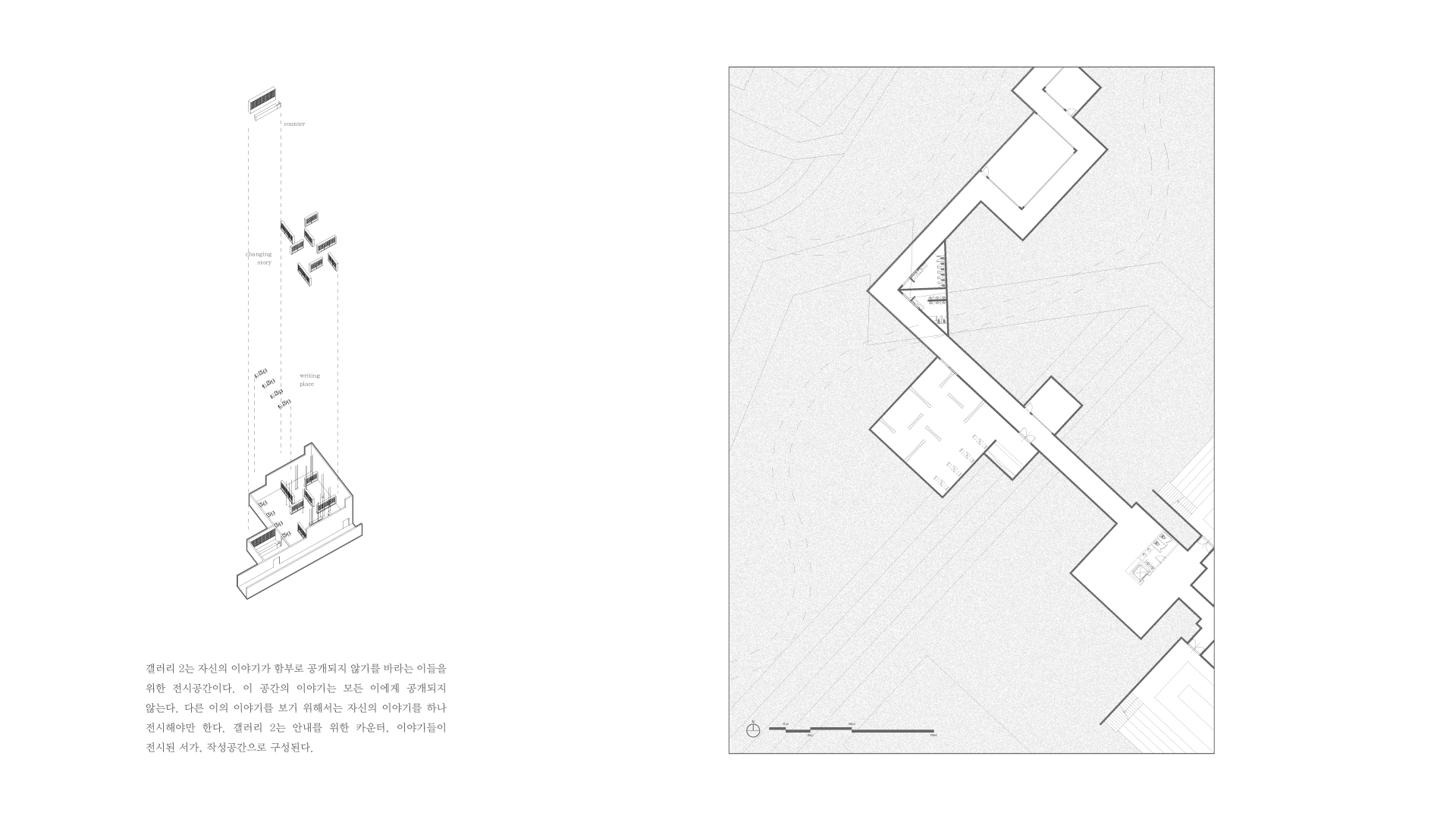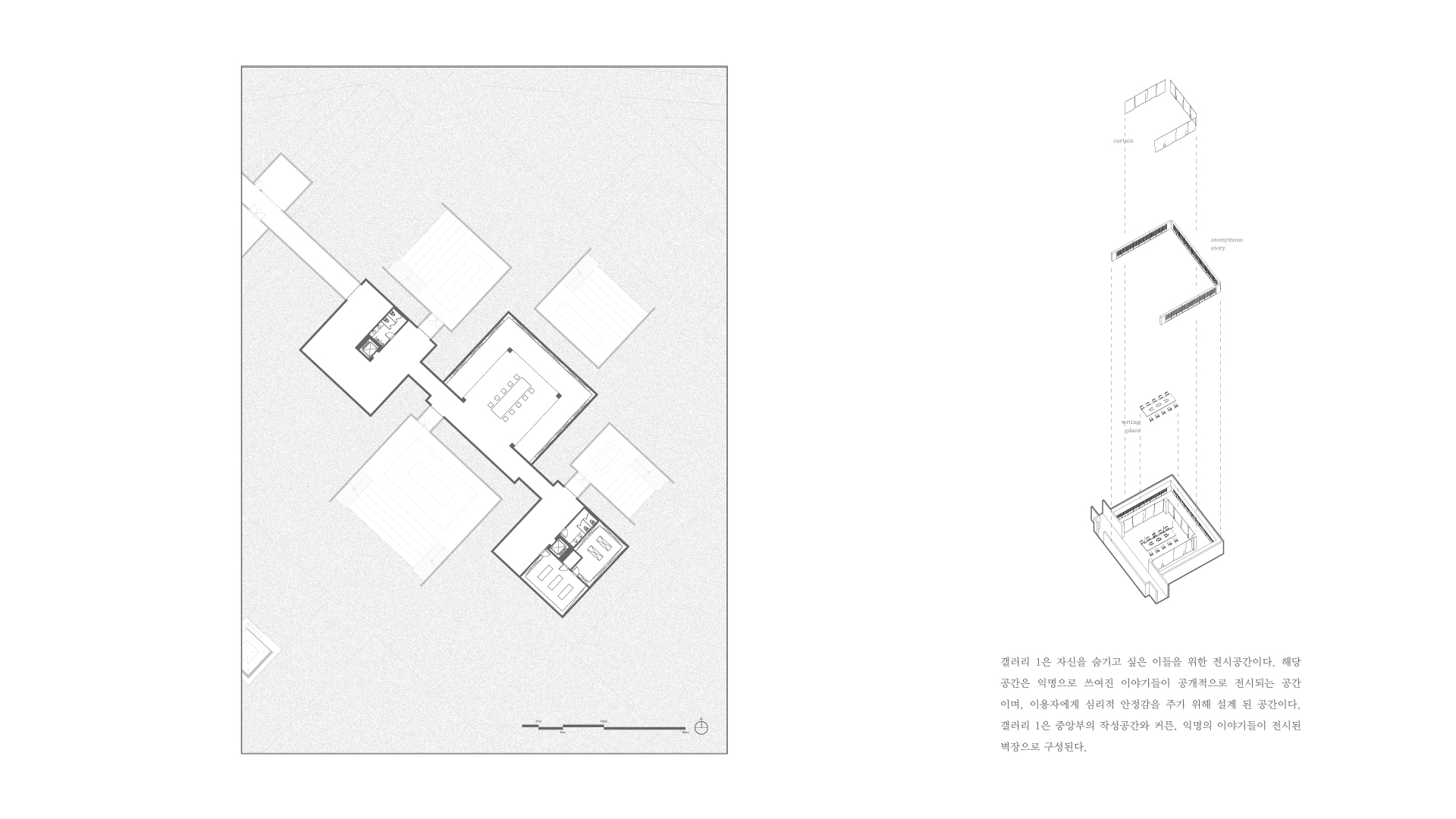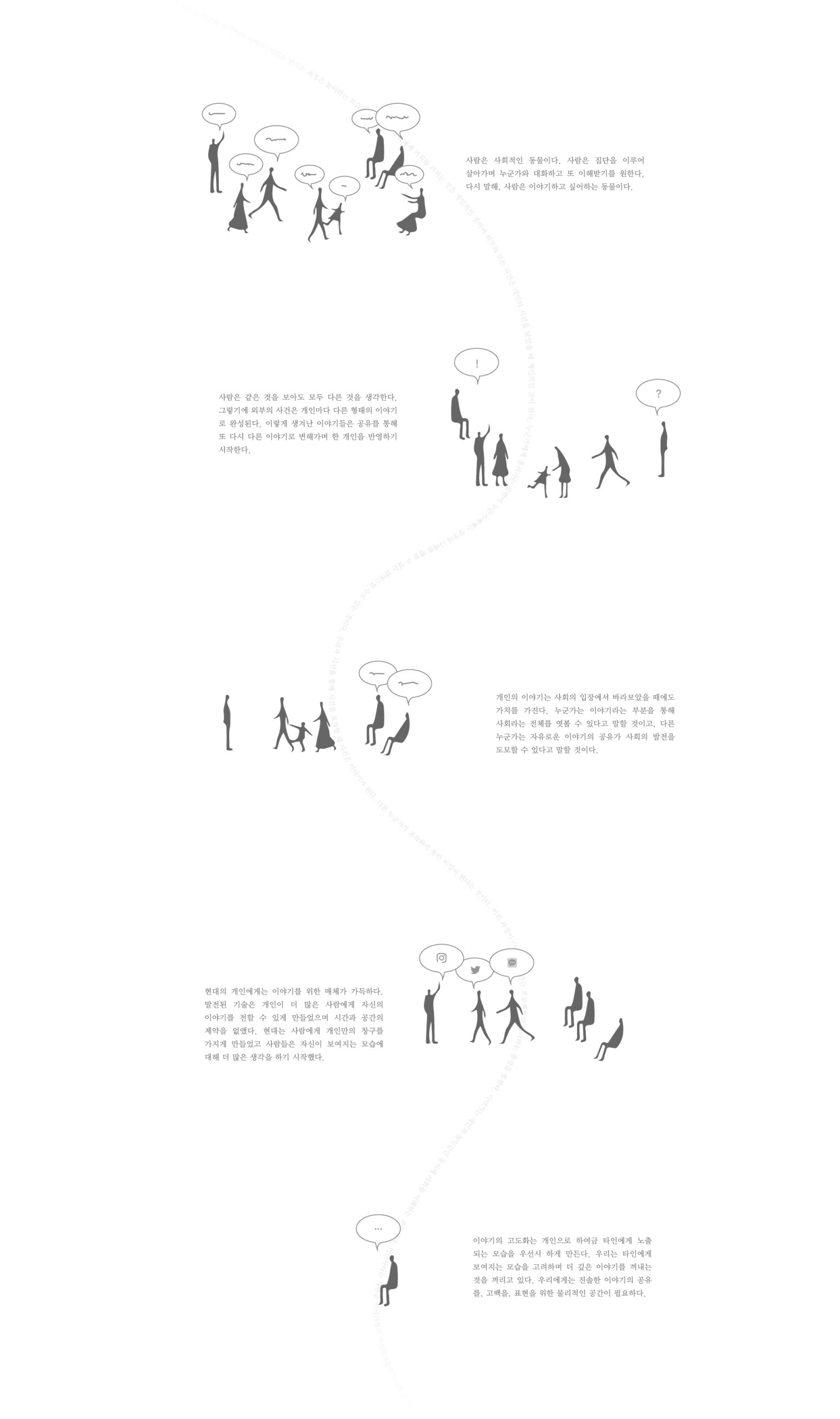 외부의 사건은 개인의 시선을 통해 하나의 이야기가 된다. 외부의 일을 내부의 이야기로 만드는 행위는 자신만의 비밀을 만드는 놀이와 같다. 현대는 이야기를 전달하는 매체가 그 어느 때보다도 발전한 시대이다. 현대의 우리는 쉽게 표현할 수 있지만 동시에 쉽게 공격 받고 평가 당할 수 있고, 이는 우리로 하여금 보여지는 모습을 우선시하게 만들었다. 본 프로젝트는 이와 같은 점에 주목하여 이야기를 하고 싶은 욕구를 위한 공간을 설계하고자 한다.