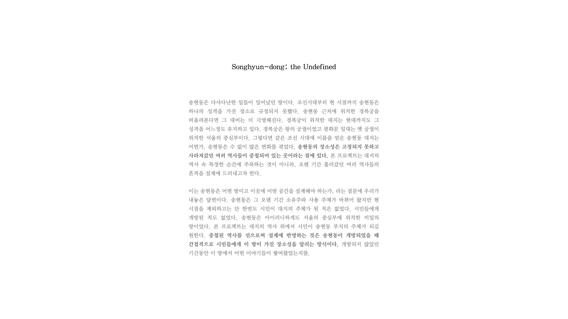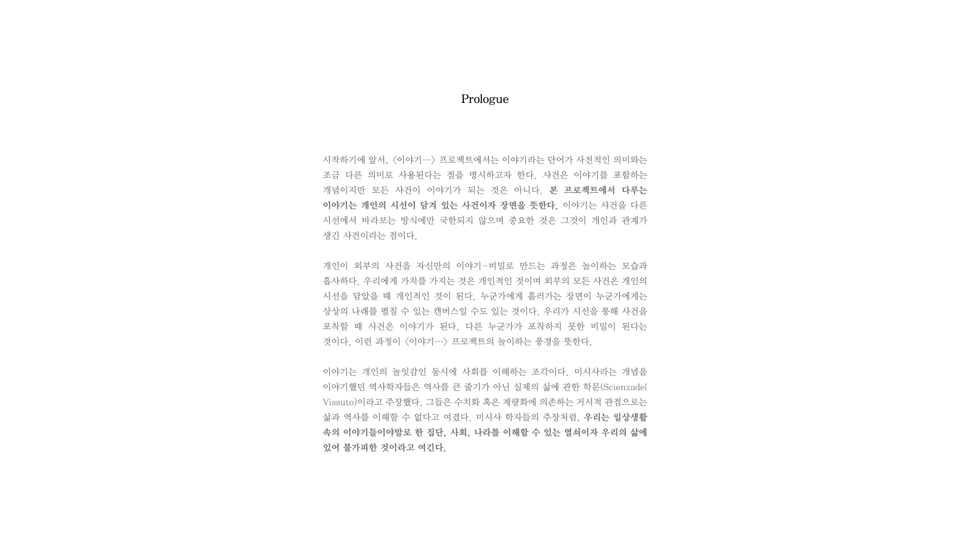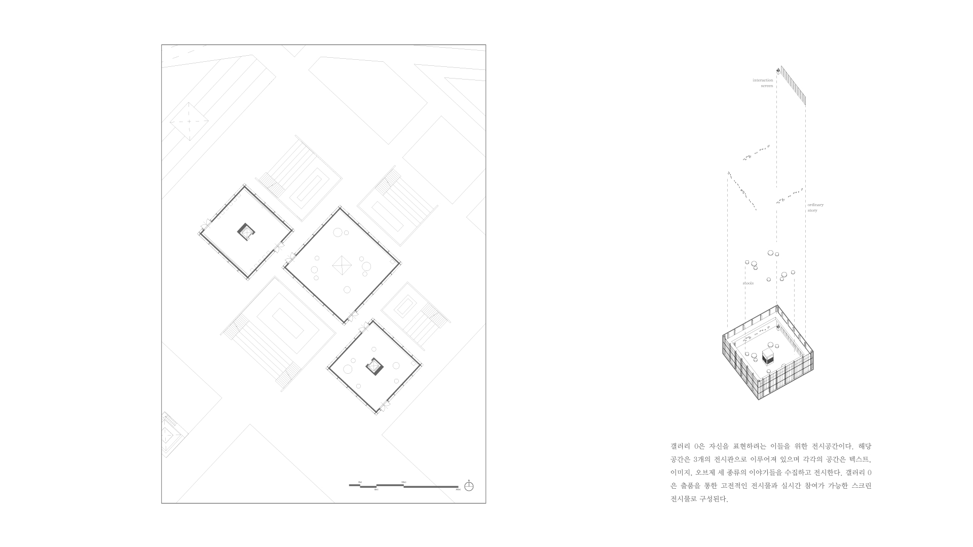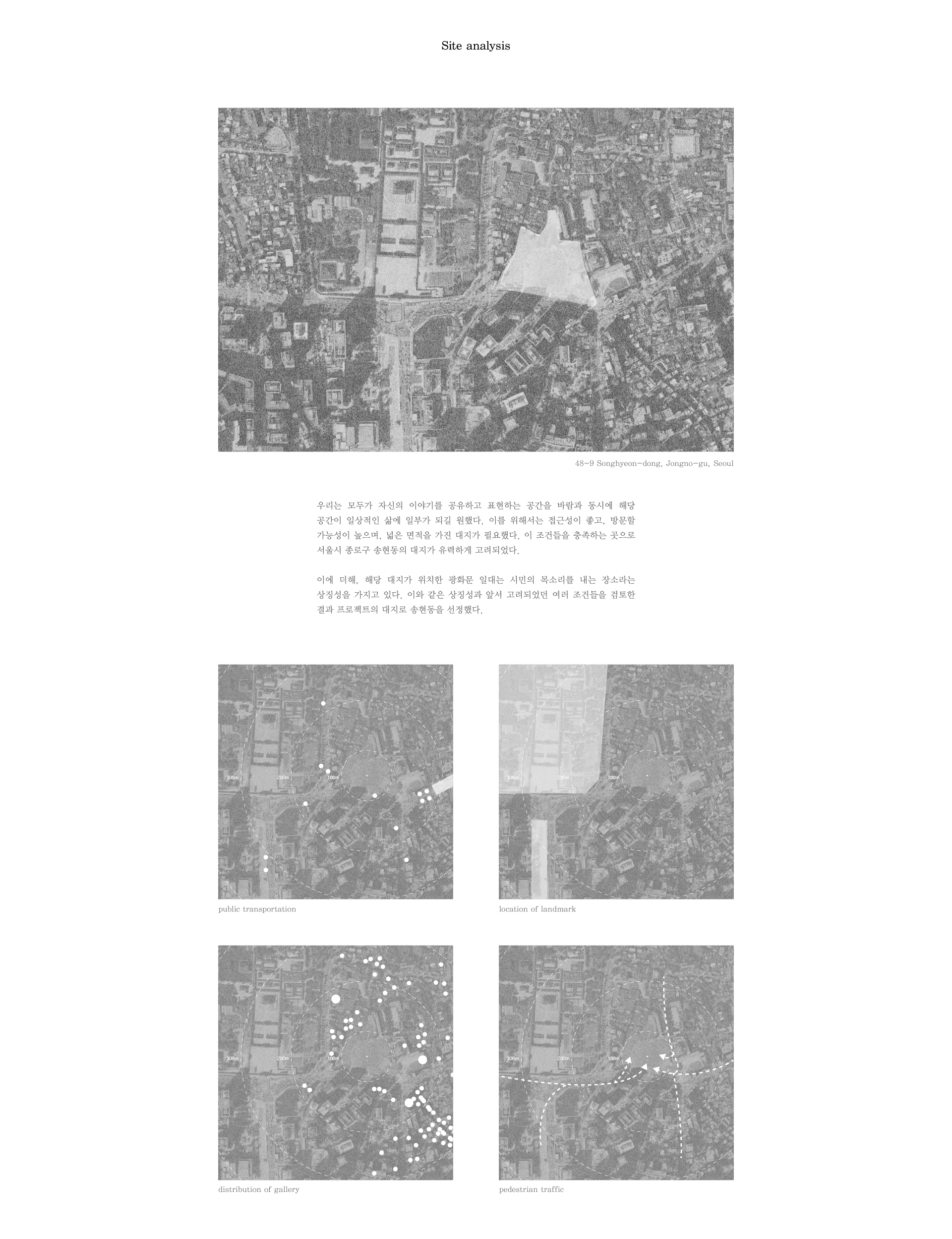 외부의 사건은 개인의 시선을 통해 하나의 이야기가 된다. 외부의 일을 내부의 이야기로 만드는 행위는 자신만의 비밀을 만드는 놀이와 같다. 현대는 이야기를 전달하는 매체가 그 어느 때보다도 발전한 시대이다. 현대의 우리는 쉽게 표현할 수 있지만 동시에 쉽게 공격 받고 평가 당할 수 있고, 이는 우리로 하여금 보여지는 모습을 우선시하게 만들었다. 본 프로젝트는 이와 같은 점에 주목하여 이야기를 하고 싶은 욕구를 위한 공간을 설계하고자 한다.