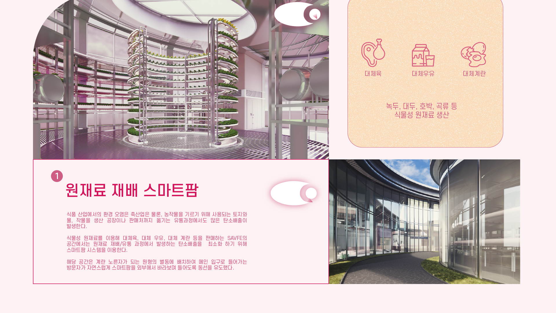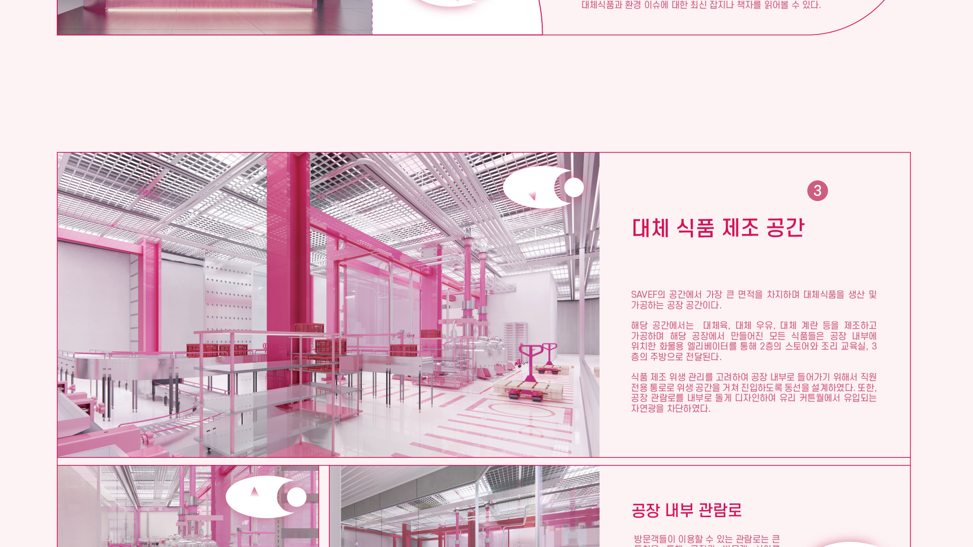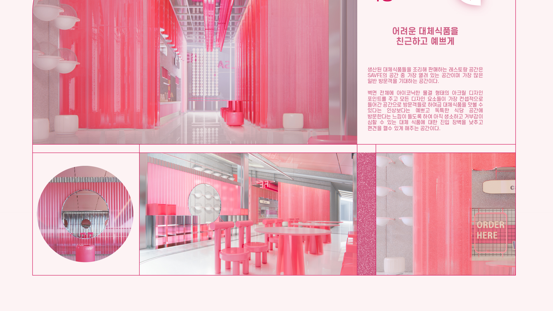 SAVFE is a space designed to familiarize people with alternative foods. It serves a space to SAVE the environment for SAFE food, allowing visitors to experience the entire process from production to cooking. SAVFE includes food consulting content that leads changes in users’ lifestyles. It features pink as a key color and presents an unconventional color in the F&B area to create a warm mood while creating a new trend space in food culture.