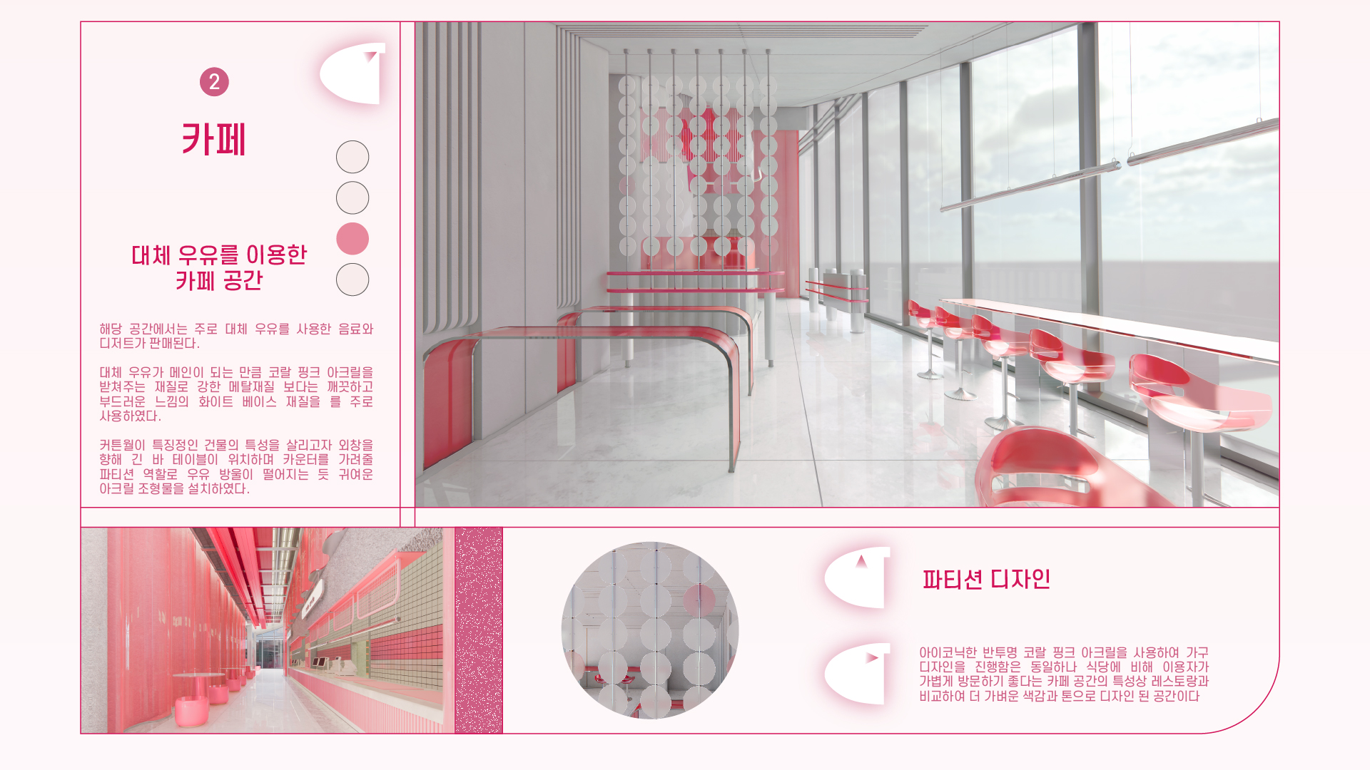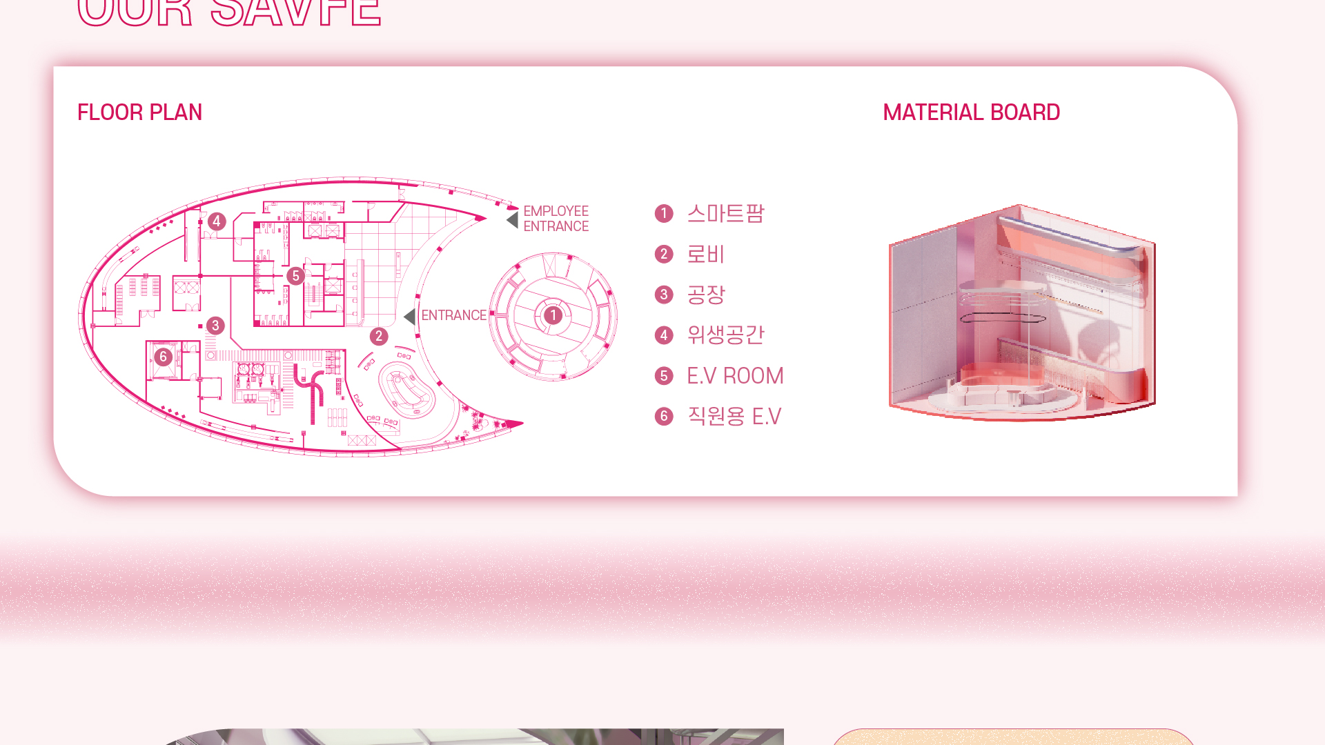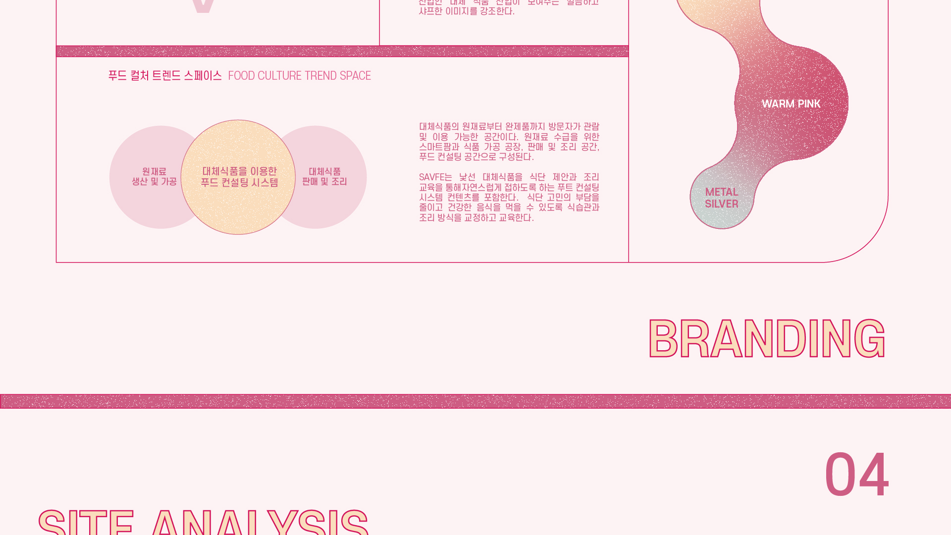 SAVFE is a space designed to familiarize people with alternative foods. It serves a space to SAVE the environment for SAFE food, allowing visitors to experience the entire process from production to cooking. SAVFE includes food consulting content that leads changes in users’ lifestyles. It features pink as a key color and presents an unconventional color in the F&B area to create a warm mood while creating a new trend space in food culture.