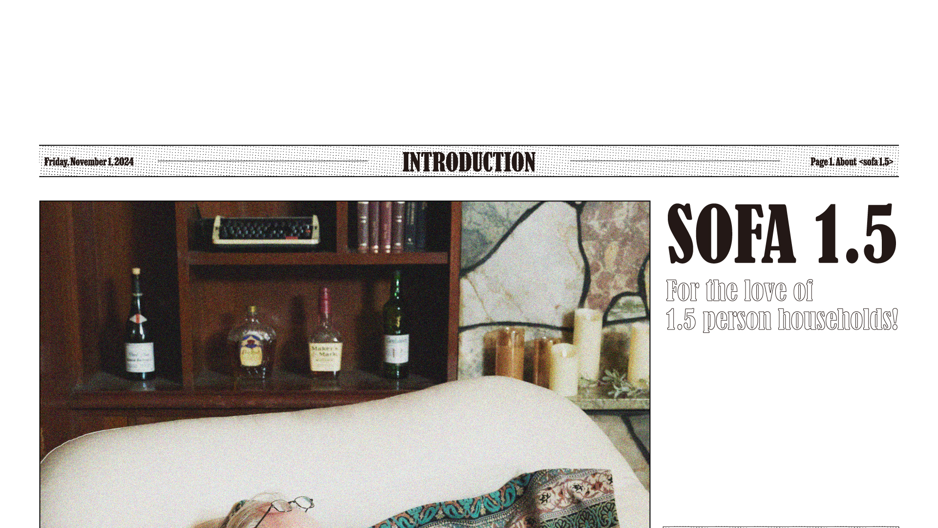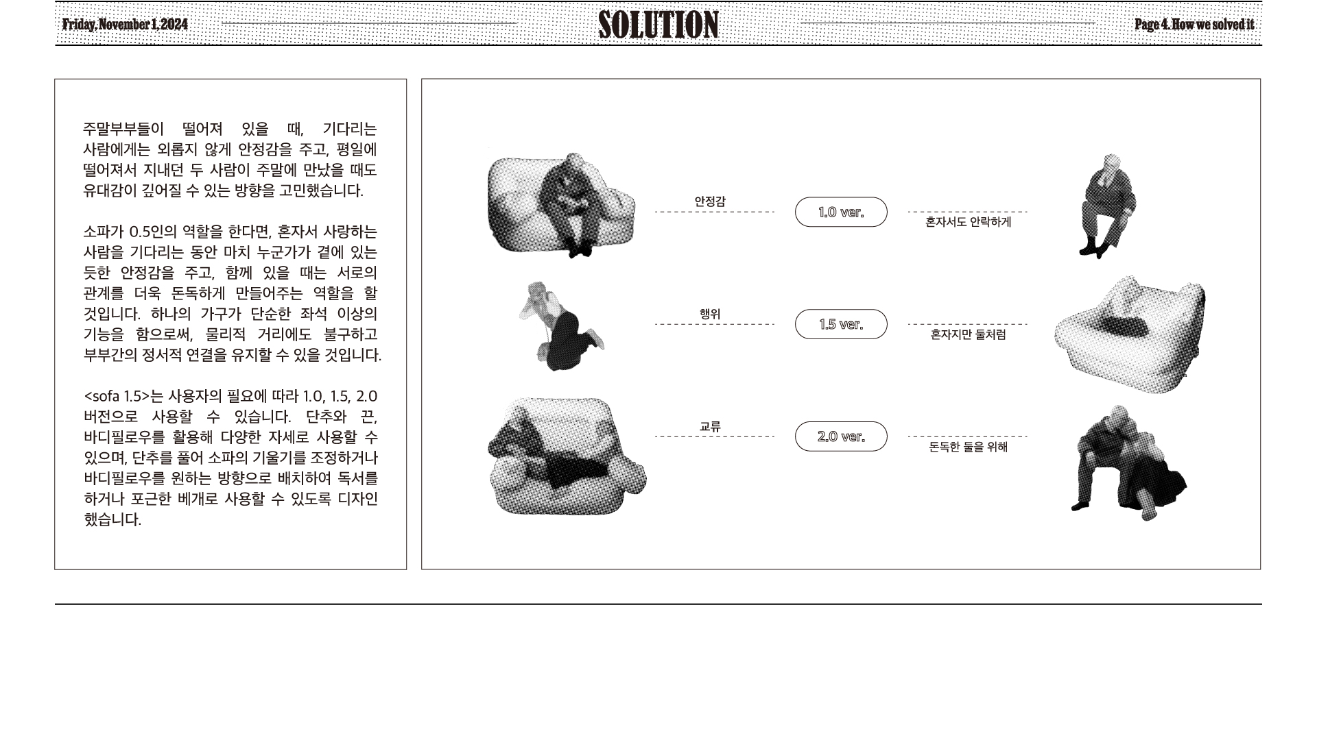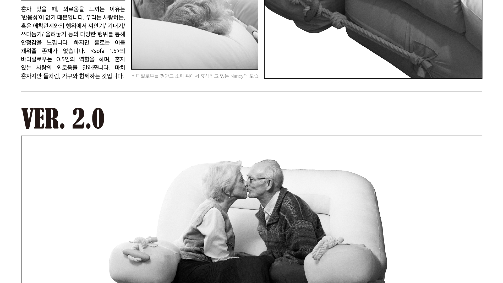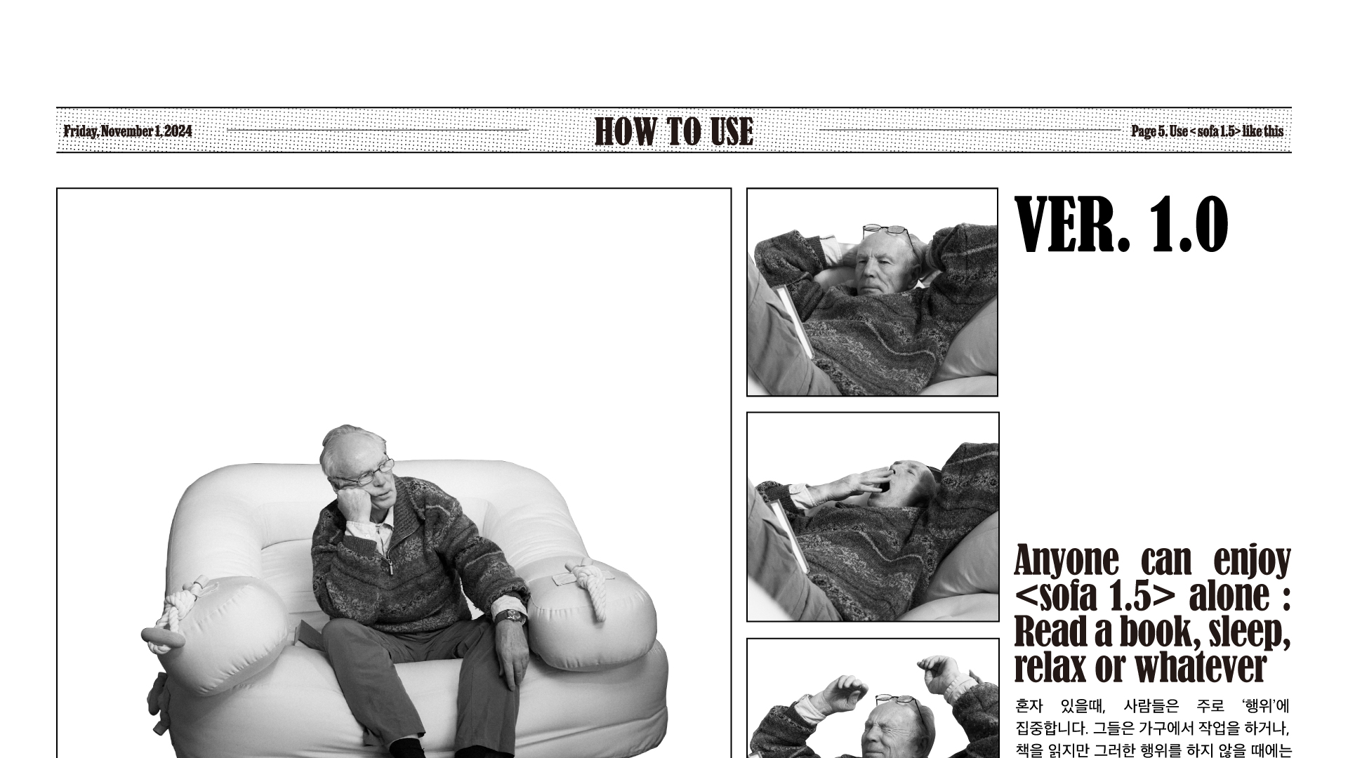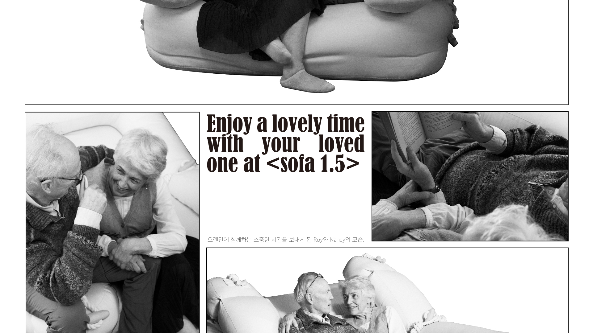 “sofa 1.5″는 주말부부와 같은 1.5인 가구를 위해 디자인 된 소파입니다. 물리적 거리로 인해 혼자 남겨진 사람이 외롭지 않도록 소파가 0.5인의 역할을 하여 정서적 안정감을 채워주고, 사랑하는 사람과 함께할 때는 떨어진 시간의 간극을 채워줄 수 있는 돈독함을 제공합니다. 소파는 사용자의 편의에 따라 다양한 버전으로 활용될 수 있어 혼자, 또는 누군가와 함께 원하는 목적에 맞게 사용할 수 있습니다.